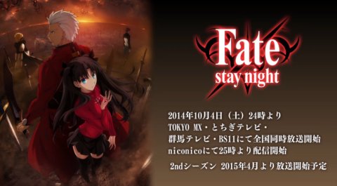 | 放送時期は10月4日24時からで、放送局はTOKYO MX・とちぎテレビ・群馬テレビ・BS11にて全国同時放送開始。niconicoにて25時より配信開始。2ndシーズンは2015年4月より放送開始予定。描かれるのは“Unlimited Blade Works(遠坂凛ルート)”となる。 また、主題歌アーティストも発表された。オープニングテーマは綾野ましろさん、エンディングテーマはKalafinaさんが担当する。 |