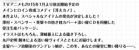 「冴えない彼女の育てかた」公式にて「ヒロインズ抱き枕カバーボックス」プロジェクト」が告知されました。(⇒公式サイト)
