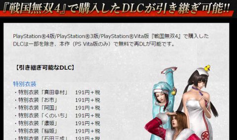 私は「戦国無双4」でDLC衣装をかなり買ったんで、これは素直に嬉しいです。