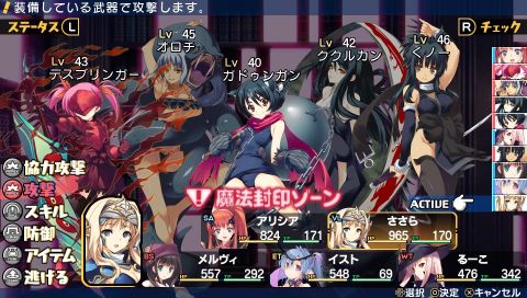 魔法封印ゾーンではメルヴィ(ビショップ)とるーこ(ウィッチ)はいないも同然なので、アリシア(侍)とささら(ヴァルキリー)にひたすら範囲攻撃スキルを使わせてました。うちは前衛2人のパーティ構成だから、魔法封印されると一挙に弱くなるのよねぇ…。