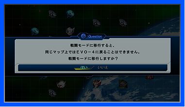 ▲「戦闘モード」を選択すると、確認メッセージが表示されます。なお、同じマップで「EVO‐4」に戻ることは出来ません。