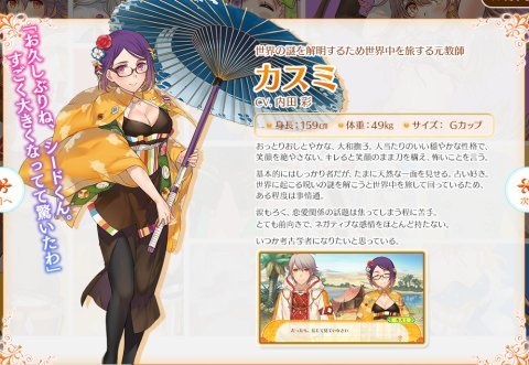 | 世界の謎を解明するため世界中を旅する元教師 カスミ CV:内田彩 「お久しぶりね、シードくん。すごく大きくなってて驚いたわ」 おっとりおしとやかな、大和撫子。 人当たりのいい穏やかな性格で、笑顔を絶やさない。 キレると笑顔のまま刀を構え、怖いことを言う。 基本的にはしっかり者だが、たまに天然な一面を見せる。 占い好き。 世界に起こる呪いの謎を解こうと世界中を旅して回っているため、ある程度は事情通。 涙もろく、恋愛関係の話題は焦ってしまう程に苦手。 とても前向きで、ネガティブな感情をほとんど持たない。 いつか考古学者になりたいと思っている。 |