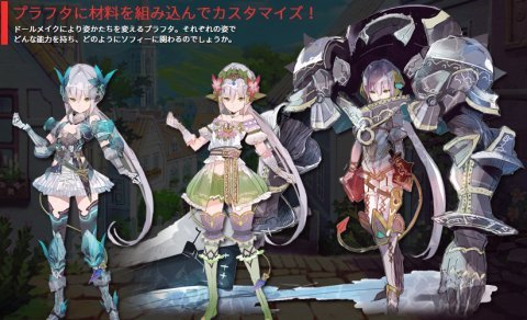 | 錬金術の集大成:ドールメイク ソフィーと錬金術の力によって本から人の姿となったプラフタ。 さらに彼女は“ドールメイク”と呼ばれる力によってさまざまな姿になります。 ドールメイクとは、錬金術で生み出した材料をプラフタの体に組み込んでカスタマイズする、錬金術の集大成とも言えるべき力。 錬金術を深く知るほど、ドールメイクのカスタマイズの数も増えていきます。 |