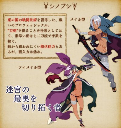 忍者と侍の両方の特性を持った剣士でしょうか。女シノブシの方、すっごい貧乳だね…