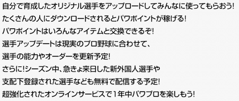 | 早期購入特典(パッケージ版、ダウンロード版共通) ●歴代オープニング曲ダウンロードコンテンツ 歴代パワプロシリーズのオープニング楽曲20曲以上を収録したダウンロードコンテンツです。 今作新たに搭載されたBGM設定機能で、各モードのメニュー画面や試合中にオープニング曲を割り当てて遊ぶことができます。 ●「実況パワフルプロ野球サクセススペシャル」で使用できるイベキャラ「熱盛 宗厚」SR |