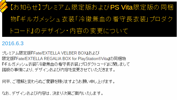 ◆【お知らせ】プレミアム限定版およびPS Vita限定版の同梱物『ギルガメッシュ衣装「冷徹無血の看守長衣装」プロダクトコード』のデザイン・内容の変更について ≪ News | Fate/EXTELLA(フェイト/エクステラ) 公式サイト