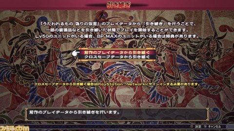 | ■『うたわれるもの 偽りの仮面』のプレイデータからの引き継ぎ 本体に保存されている『うたわれるもの 偽りの仮面』のプレイデータ、もしくはクロスセーブデータから引き継ぎを行うことで、一部の装備品などを引き継いだ状態でプレイを開始することが可能に。引き継げる装備品は、1種類につきひとつとなる。 ※クロスセーブデータを利用することで、ほかの機種のプレイデータから引き継ぐことが可能です。 ・引き継ぎ特典 引き継ぐプレイデータで特定の条件を満たしている場合は下記の特典が追加されます。 ※下記の特典は最大でひとつづつとなります。 ○極意:取得経験値増加 レベル50のユニットがひとり以上いる。 ○極意:取得BP増加 BPMAXに必要なだけのBPを所持しているユニットがひとり以上いる。 ※BPは割り振りを完了している必要はありません。 |