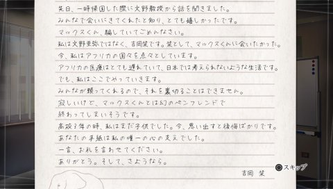 吉岡栞は主人公との文通に影響され、今はアフリカの医療発展に人生を捧げているとのこと。