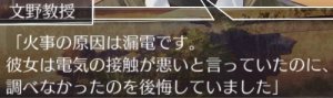 今回のルートでは「火事」については全く絡んでこなかったけど、違うルートでは「火事」が重要な展開もありそうですね。PVとか見ると。