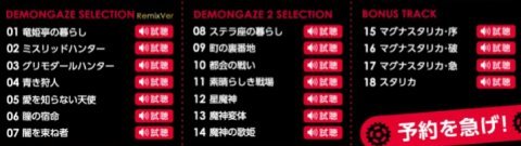 | ■予約特典『BEST SELECTION DEMON GAZE MUSIC』BOUNSTRACK新情報発表&試聴公開 「BONUSTARCKとして、主題歌『STARLLICAスタリカ』と3曲の挿入歌を完全収録」 ※詳しくは『デモンゲイズ2』公式サイト(http://demongaze.jp/dg2/)にてご確認ください。 |