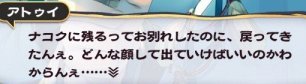 というか、これでアトゥイがもうエンディングまで出てこないとかなったら嫌なんですけどー!うわあああああああ!