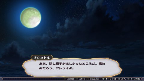 ていうか、このシーンは抜けたと思ったアトゥイが戻ってきた嬉しさと、幻想的な月夜のシチュエーションが相まって、私的にはゲーム中のお気に入りNO1イベントシーンになりました。ここまでの中でね。