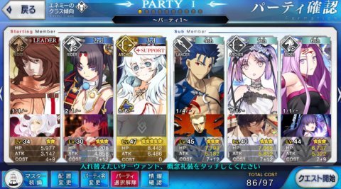 セイバー・ランサー・ライダー・キャスターの最高レベルが50代ではキツイ場面も多かったけど何とかなったよ。