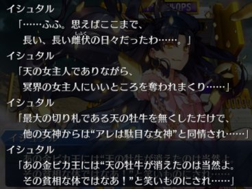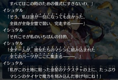 無事に全員がゴールを迎えたと思ったら、ついにイシュタルが本性を現したところからですね。