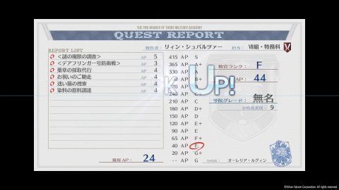 確かユウナでしたっけ、経験値アップのマスタークオーツが初期セットのキャラ。つけっぱだとあっさりリィンのレベル越しちゃうので、教官の威厳を保つために、そっとリィンに付け替えていました…w
