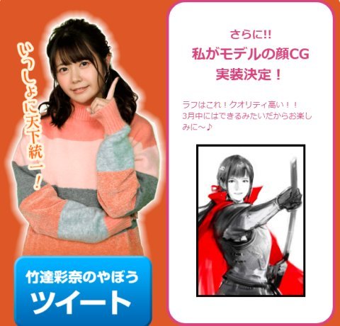 竹達彩奈さんをモデルにした武将CGが登場するんですね。強そうw