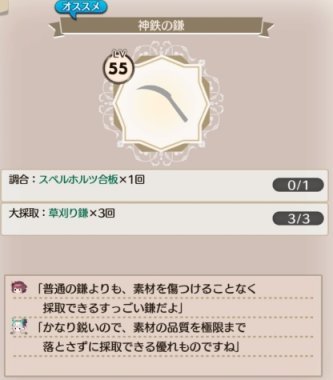 草刈り鎌の上位「神鉄の鎌」の必要素材だったので、ずっと作りたかったのよね。