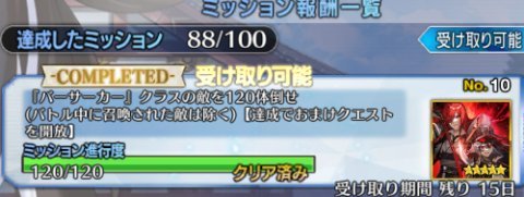 ちなみにこのミッションには「上位条件」があって、最終的には「バーサーカー120体を倒せ」が必須条件になります。