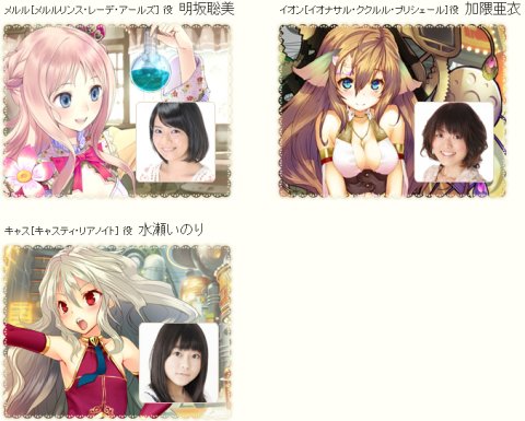 前回のティザーオープン時に門脇さん(ロロナ)名塚さん(トトリ)明坂さん(メルル)などが出演することは記載されていましたが、加隈さん(イオン)、水瀬さん(キャス)の2人も出演決定。