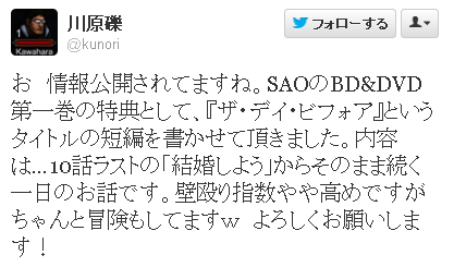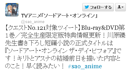 ソードアートオンライン公式サイトにて、BD第1巻の特典となる小説『ソードアート・オンライン ザ・デイ・ビフォア』の詳細が公開されました。