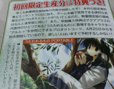 初回限定版には「設定資料集・ミニサントラCD・DLコード」が付属、早期特典はアルルゥ(うたわれ)を仲間に出来るコードとのこと。