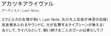 収録曲第1弾はアカツキアライヴァル、カラフルメロディ、ロミオとシンデレラの3曲とのこと。