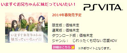 こちらのGNソフトウェアは今までPSPでギャルゲーを発売し続けてきたのですが、次回作「いますぐお兄ちゃんに妹だっていいたい!」もPSVitaでの発売が決定しています。
