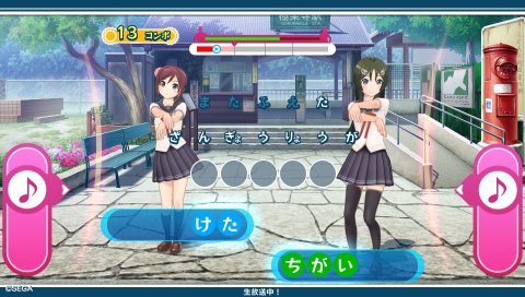 システム自体は凄くシンプルで、左の「♪」と、右の「詠」のところを、上から降ってくるワードに合わせてタッチするだけ。