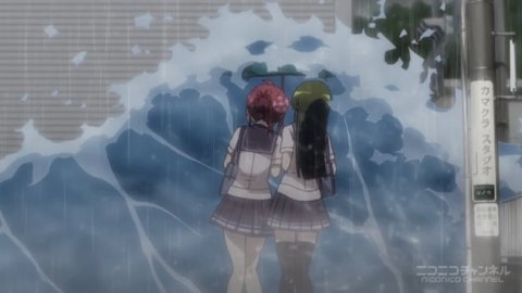 大雨の日、トラックの水ハネに飲み込まれる二人。