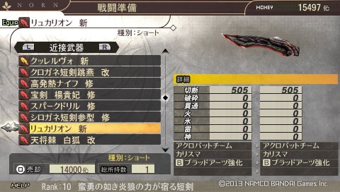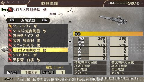 「バースト維持」と「プラーナ」を入れて、あと武器を「シロガネ短剣参型 修」に変えてみました。