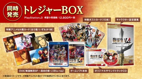 | <TREASURE BOX商品構成> ・『戦国無双4』ゲーム本体 ・『戦国無双4』キャラクター設定画集 ・特製ポストカード(15枚) ・オリジナルサウンドトラックCD ・OVA「戦国無双SP ~真田の章~」(Blu-ray) ・特製アニメセル画カード |
