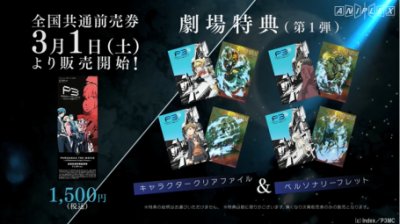 | 【前売券情報】 ●全国共通前売券(第1弾特典付き) ◆販売期間:2014年3月1日(土)より ◆販売場所: 全国の上映劇場にて販売 ◆特典内容: キャラクタークリアファイル&ペルソナリーフレット ◆価格:1500円(税込) ※特典は4種類(アイギス&パラディオン/天田 乾&ネメシス/コロマル&ケルベロス/荒垣真次郎&カストール)のうち1種 ※特典の絵柄はお選びいただけません。 ※特典は数に限りがあります。無くなり次第、前売券のみの販売となります。 ※第2弾特典は4月中旬からの展開を予定しています。 |