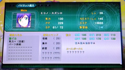 効果は「メインパイロットのSPを5回復」かぁ…。ミコノさんイマイチだよミコノさん!せっかく一番可愛いのに…。