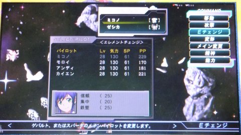 (コメントより)アクエリオンEVOLをメインに決めた春サンにアドバイス。(気付いてるかもしれないが)Eチェンジのゲパルトのキャラでモロイって奴がいるんですがコイツは気力130以上になるとゲパルトの全武装に装甲値ダウンが付与されます。敵エース倒すのに便利です。それとEVOLのパイロットはそれぞれ固有の能力があり、最初は頭搭乗の能力しか発動しませんがエースボーナスでどの形態でも発動するようになります。エースボーナスをとるほど(といっても3人まで)強くなる大器晩成型な機体です。長文失礼しました。